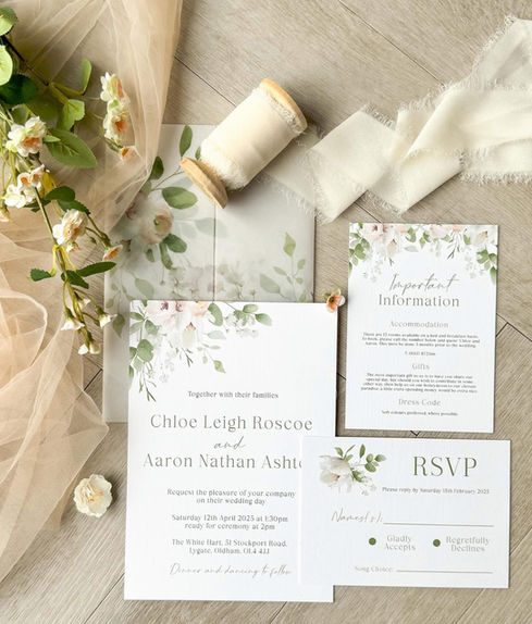 If you have already read about The Process of working with Nolah & Me, you will know that as standard, all invitations include a bespoke design. What this means is that I will create something for you from scratch based on your wedding style & vibe. And this is all included in my pricing with no hidden costs or surprises!